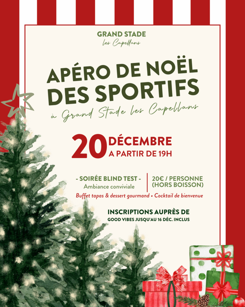 Notre soirée de Noël des sportifs approche à Grand Stade Les Capellans ! 🎄Nous vous donnons rendez-vous le 📆 𝐬𝐚𝐦𝐞𝐝𝐢 𝟐𝟎 𝐝𝐞́𝐜𝐞𝐦𝐛𝐫𝐞 ⏰ 𝐝𝐞̀𝐬 𝟏𝟗𝐡, pour partager et profiter tous ensemble d’un moment festif et convivial autour d’un blind test et d’une ambiance musicale jusqu’au bout de la nuit ! 🎉