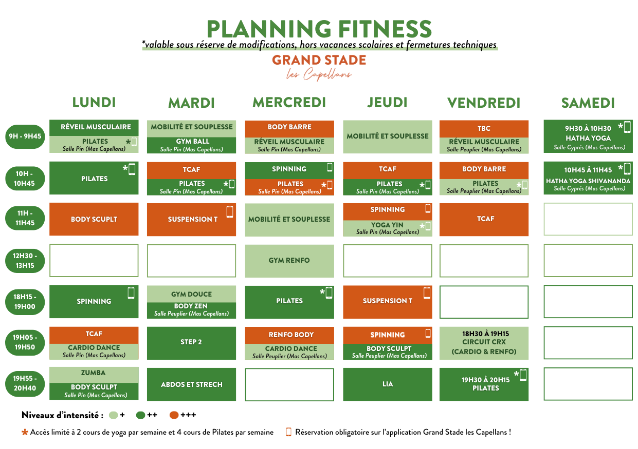 Un grand choix de cours collectifs divers et variés tout au long de la journée : spinning, cross training, suspension training, gym ball, zumba, HIIT Training et renforcement musculaire.
